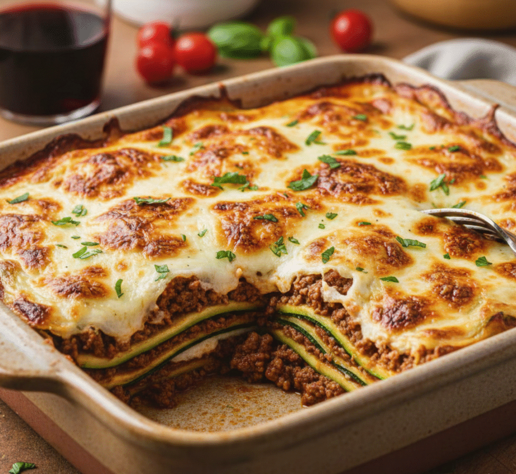 - Repetir capas (zucchini → carne → mezcla de queso) hasta llegar casi al borde de la fuente.