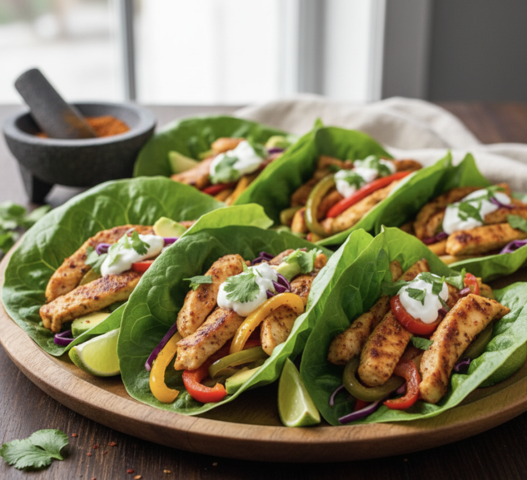 Versión fit de los clásicos tacos: en vez de tortillas de harina, se usan hojas de lechuga como “wrap”. El relleno es de pollo salteado con verduras y condimentos tipo fajita.